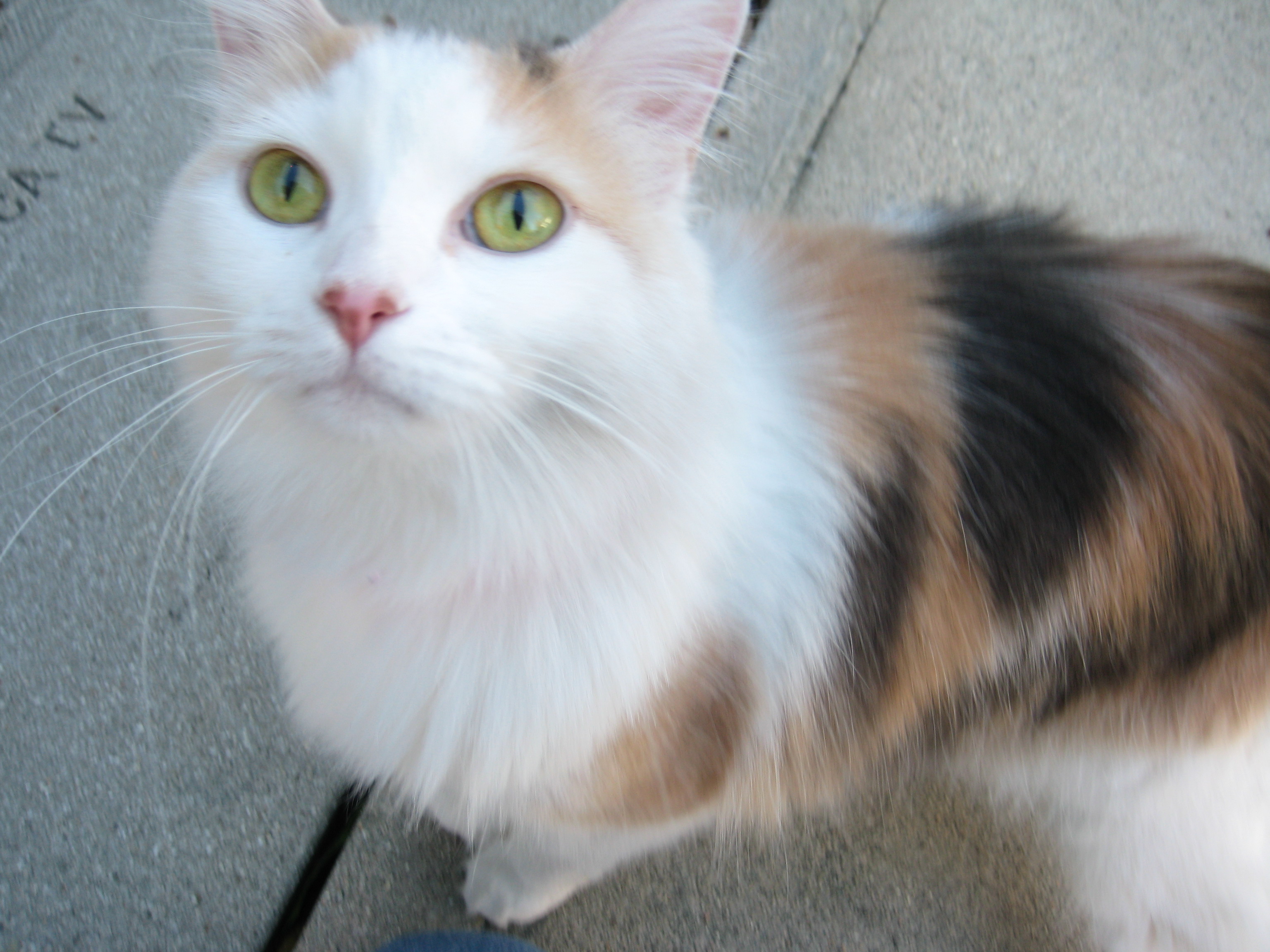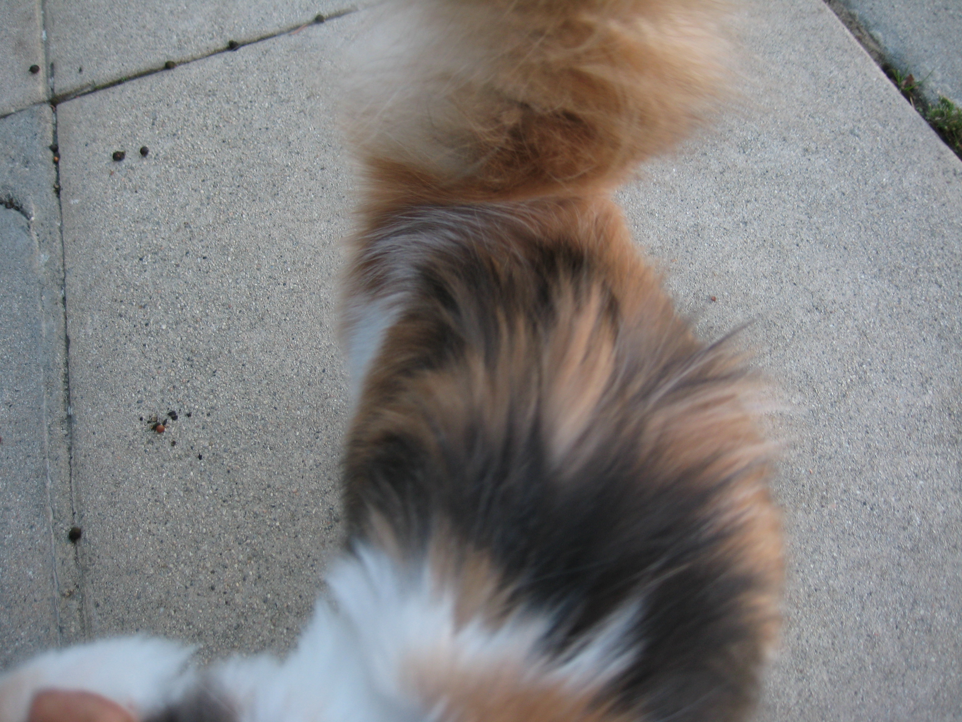 This cat attached itself to me as I walked through her neighborhood one morning. I stroked her back; she put her nose in the air and flicked her bushy tail from side to side, making the soft, bleating sounds that signal pleasure.