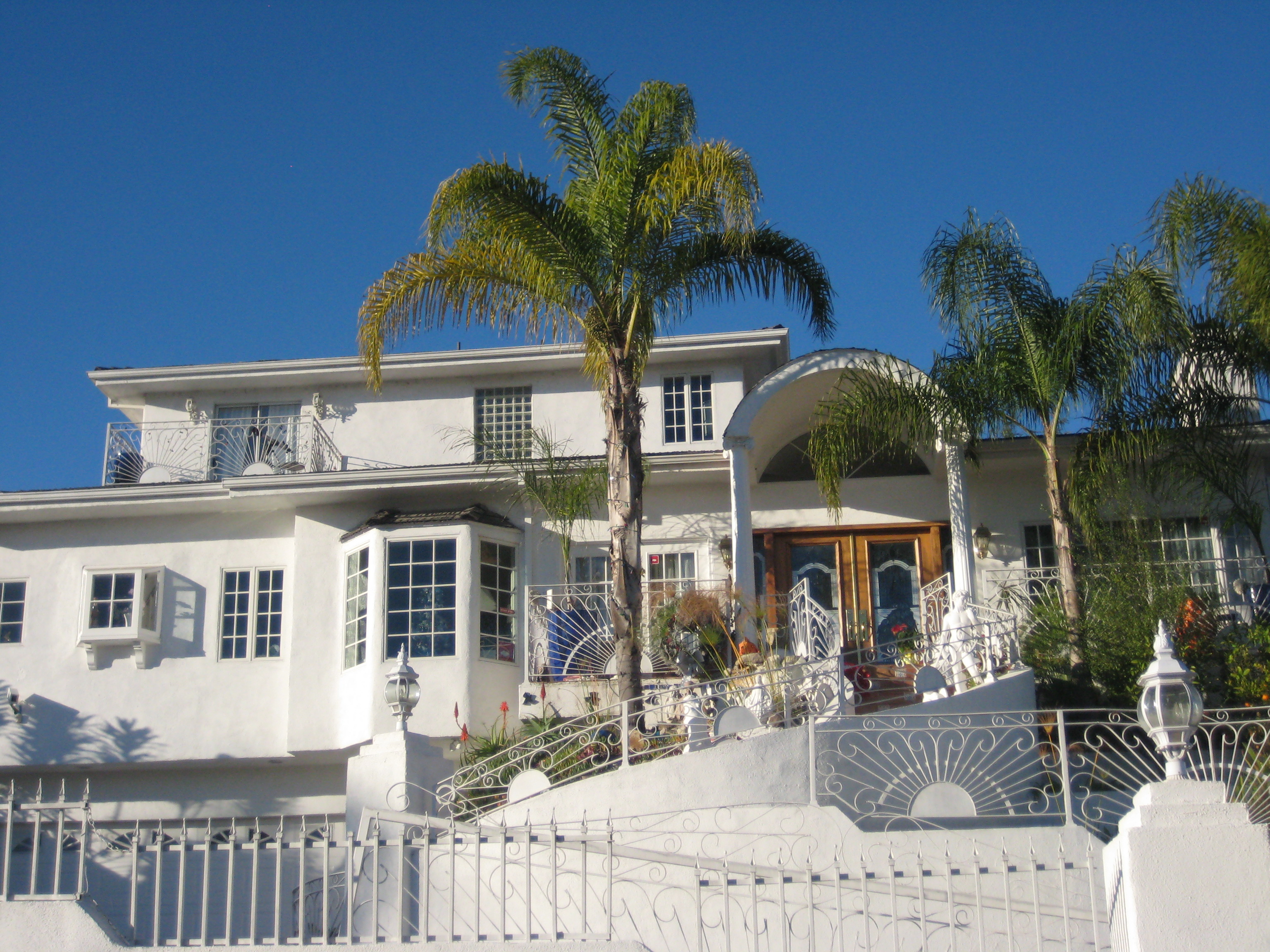 Is it the SoCal sun glaring off its white walls? That silly statue? The hodgepodge of decorative elements? Lack of landscaping? The thick-walled castle effect?
