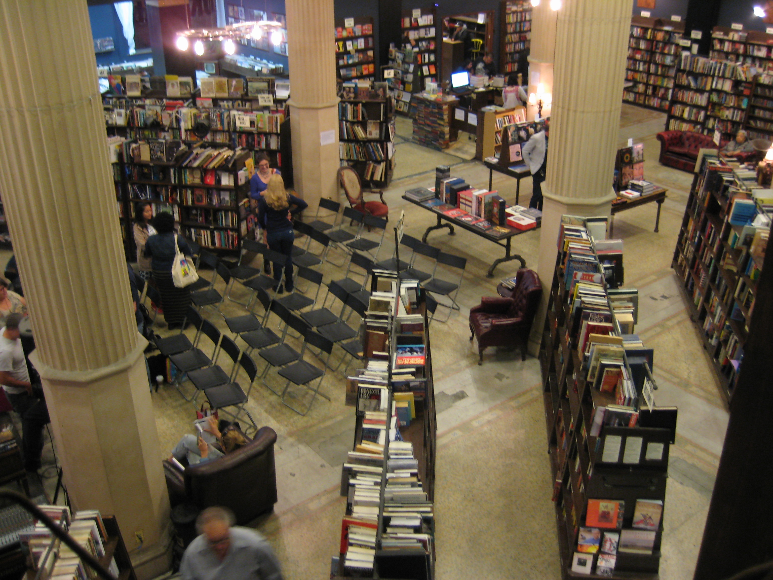 Rows of free-standing bookcases march across an expansive floor covered in the original tiny ceramic squares. Redwood-sized columns support a two-story height with a mezzanine level running along three of the walls. CDs and bins of vinyl LPs occupy an alcove that’s the size of many downtown shops.