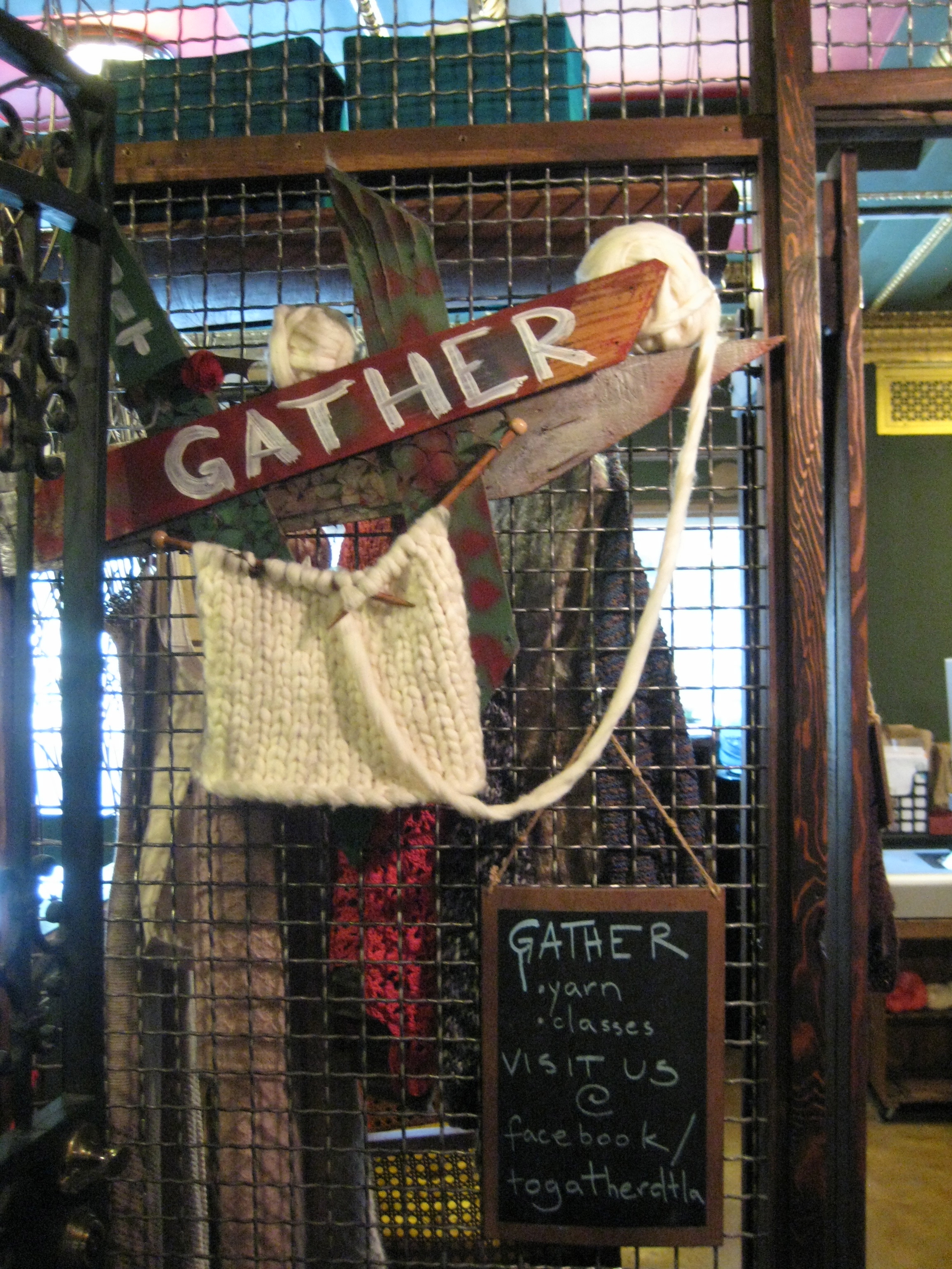 Seems that L.A. County’s local yarn shops (known simply as LYS to those of the knitting persuasion) banded together to promote their emporia by sponsoring said crawl April 11 to 14. Gather, the shop at The Last Bookstore, was one of 32 participants. You could get a “passport” –a sheet of paper with LYS names and addresses printed within small squares–stamped at every store you visited, then possibly win prizes by leaving it at the last shop you visited.