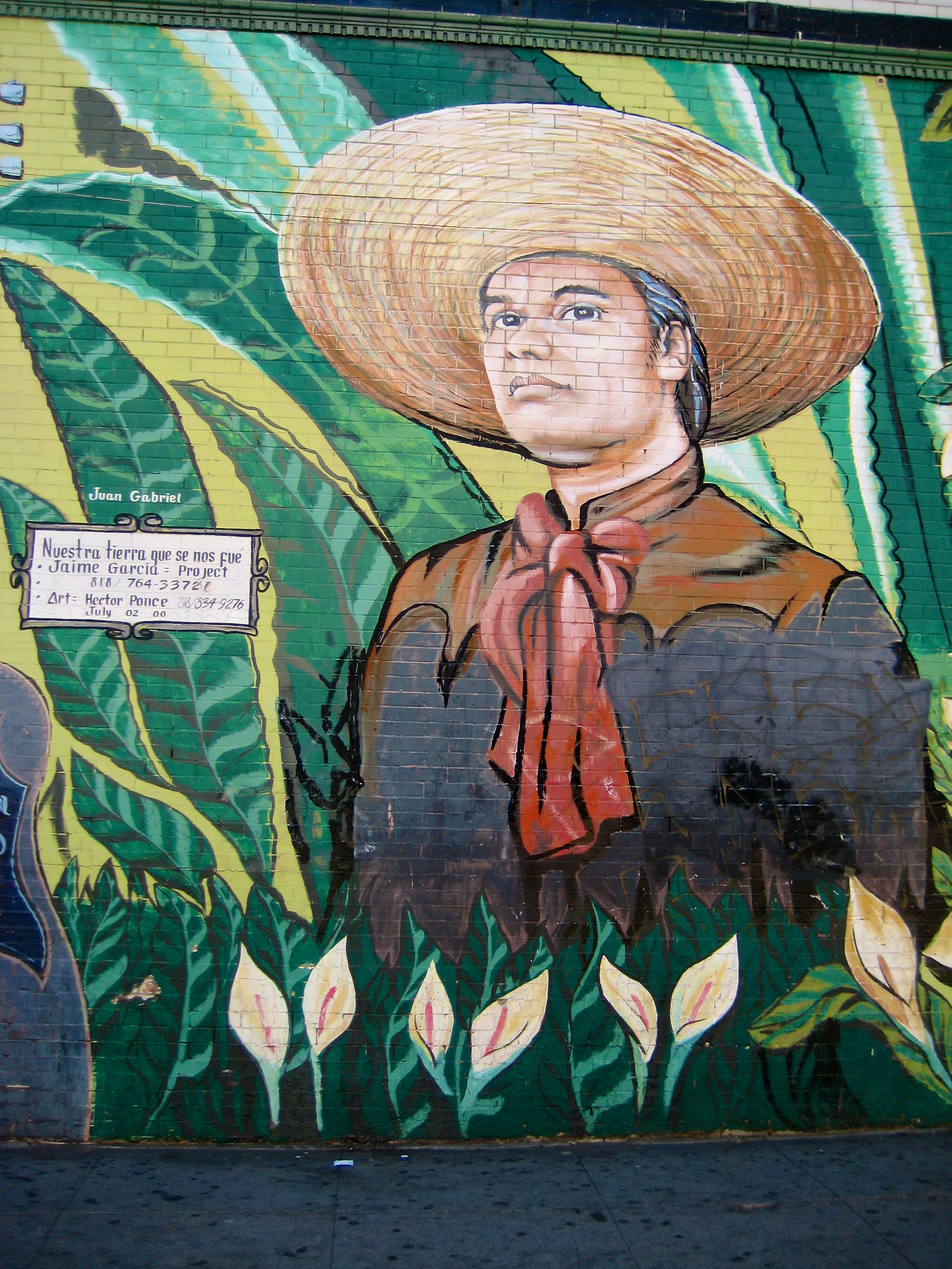 “Nuestra tierra que se nos fue,” Jaime Garcia Project, with a phone number, muralist’s name and a date. The name Juan Gabriel is painted on the wall above the frame.
