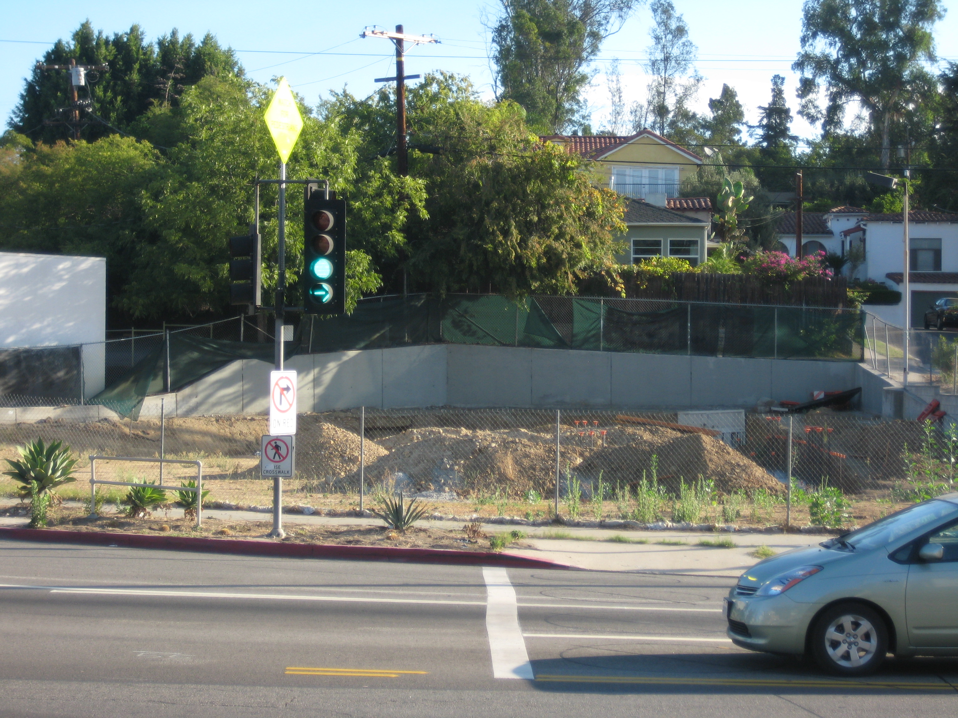 Months ago, workers dug trenches and poured footers at the plot where Glendale Blvd. makes a 90 degree turn and Rowena begins. And then . . . nothing. Dirt, concrete, rebar left as it was. Unconfirmed rumor: The developers are behind on payments.