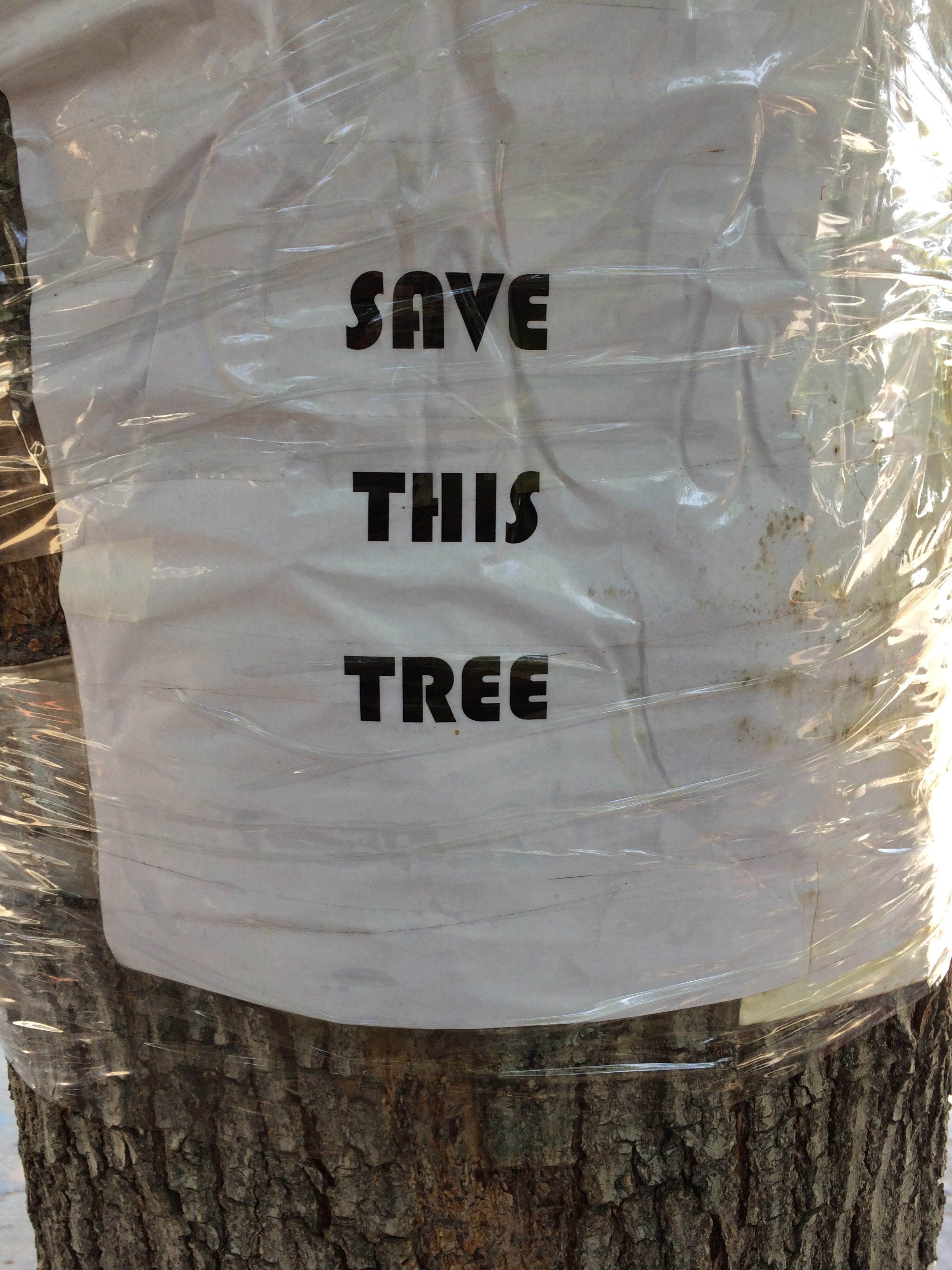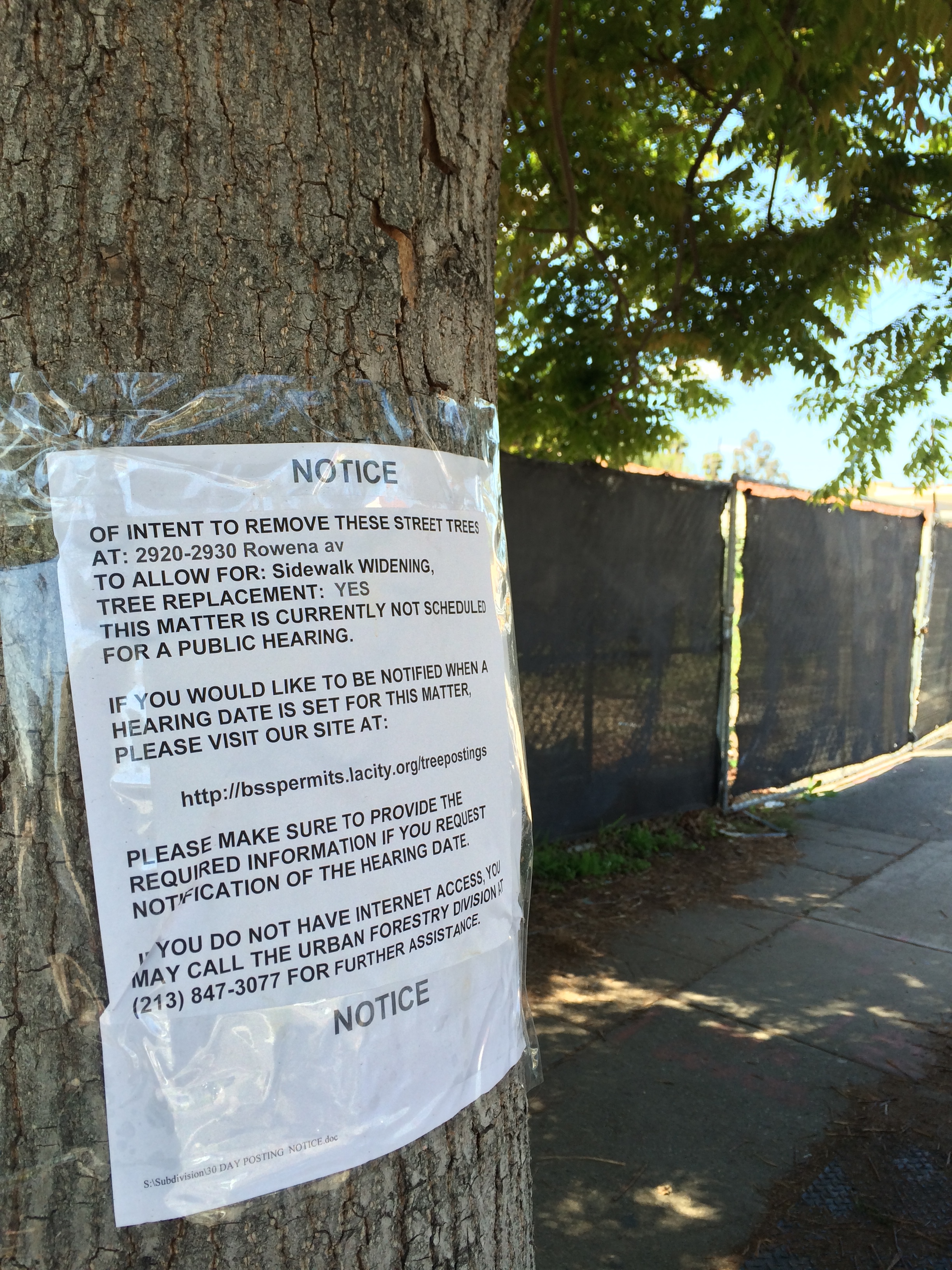 2014, when the city affixed notices to three mature shade trees–a Chinese flame and two jacarandas–announcing its intent to remove them for sidewalk widening. That got the attention of neighborhood residents, who countered with their own signs. More than a year later, the trees remain, though still under threat. The city has yet to set a hearing regarding their removal.