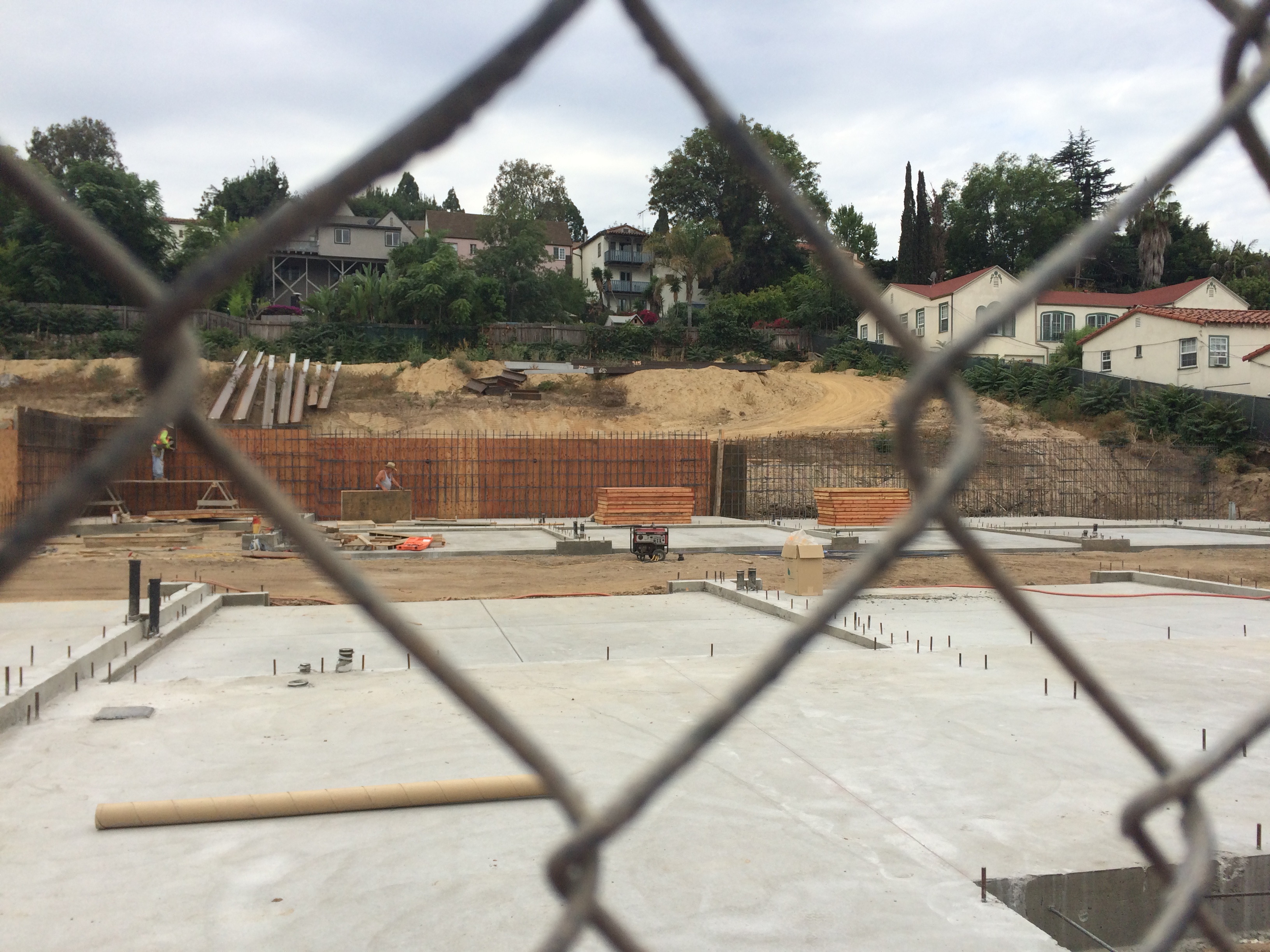 Earlier this year, construction finally began: workers graded the parcel, poured concrete slabs, and began work on a concrete retaining wall.