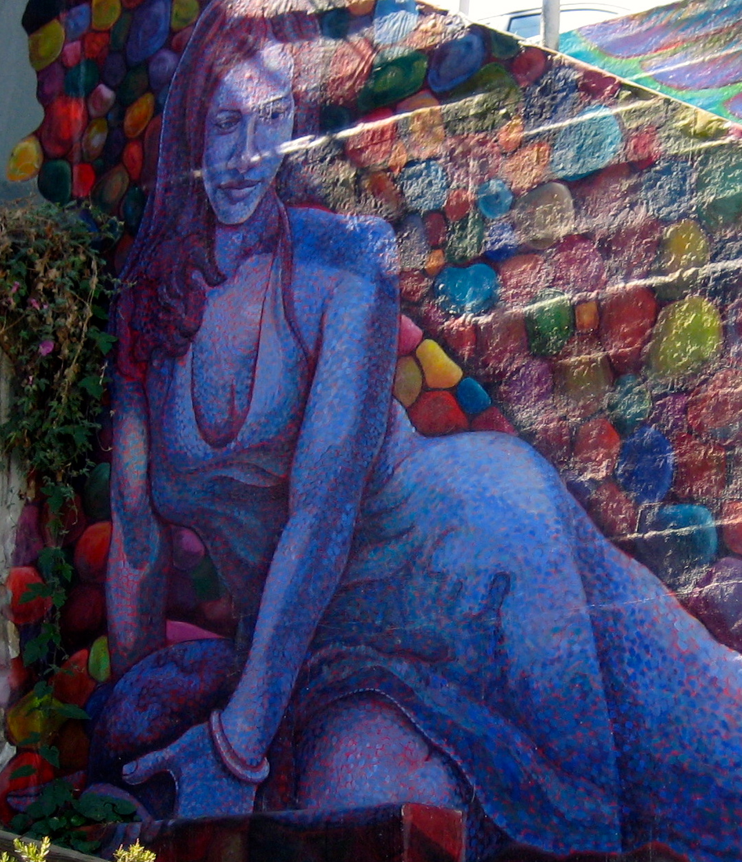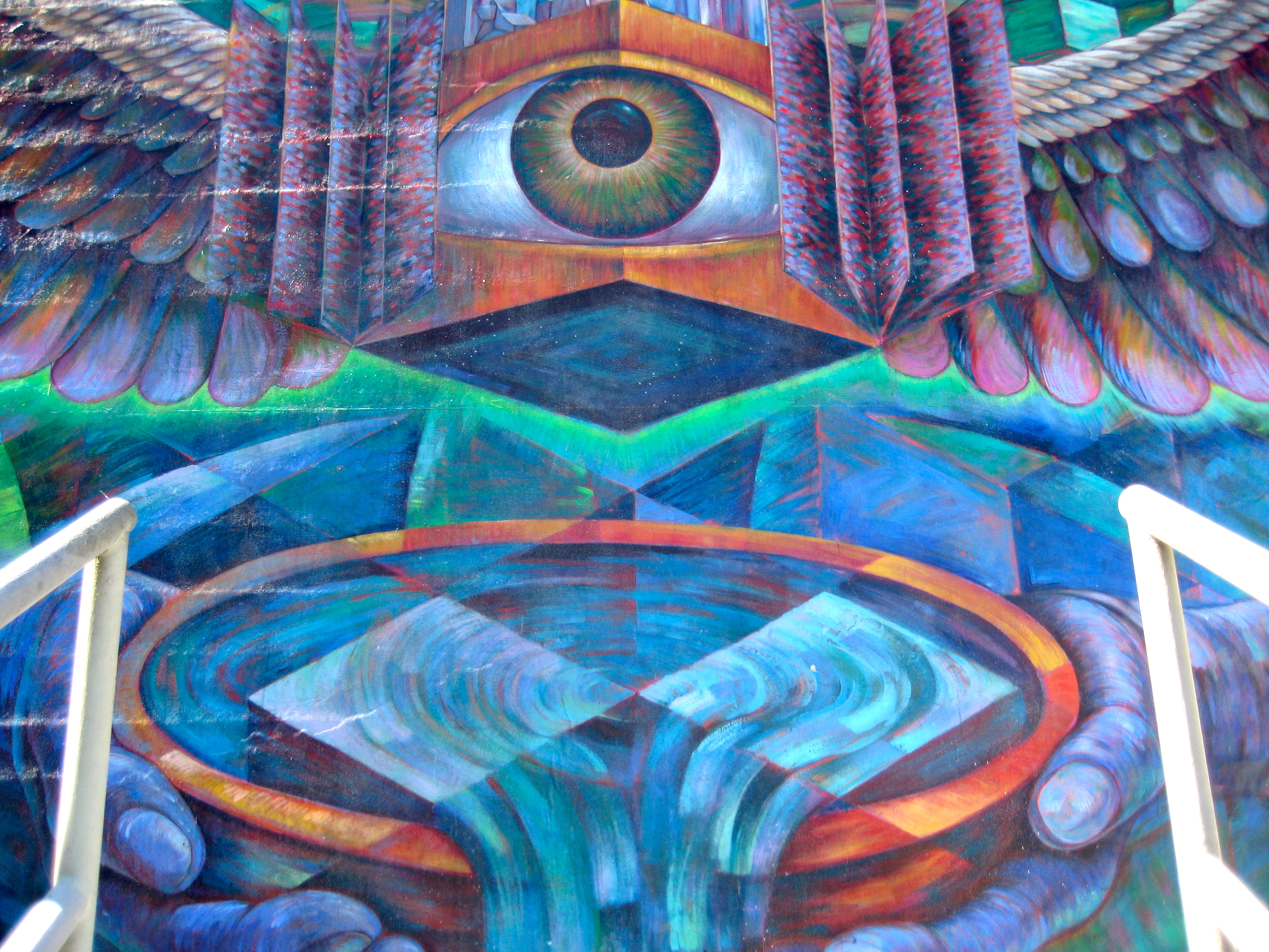 The female figure below the west stairs looks like she’s lifting the earth. To the east, the male clasps a young tree. To me, the mural is redolent of fecundity, creation, our rootedness in the earth. I find it intriguing, calming and cooling (all that blue), provocative. What do you think?